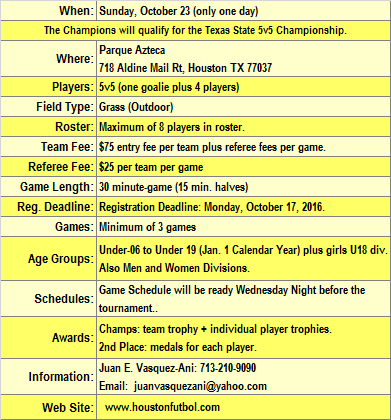 Tournament Director: Juan E. Vasquez-Ani, Cell: 713-210-9090, juanvasquezani@yahoo.com |